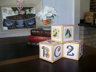 Adoro esses cubos! Eu os fiz com caixinhas de leite...recortei no formato de cubos, encapei com papel vergê, pintei de dourado, colei um quadrado menor de papel ofício rosa e no meio do quadrado, adesivos de pássaros, letras e números que encontrei na net.